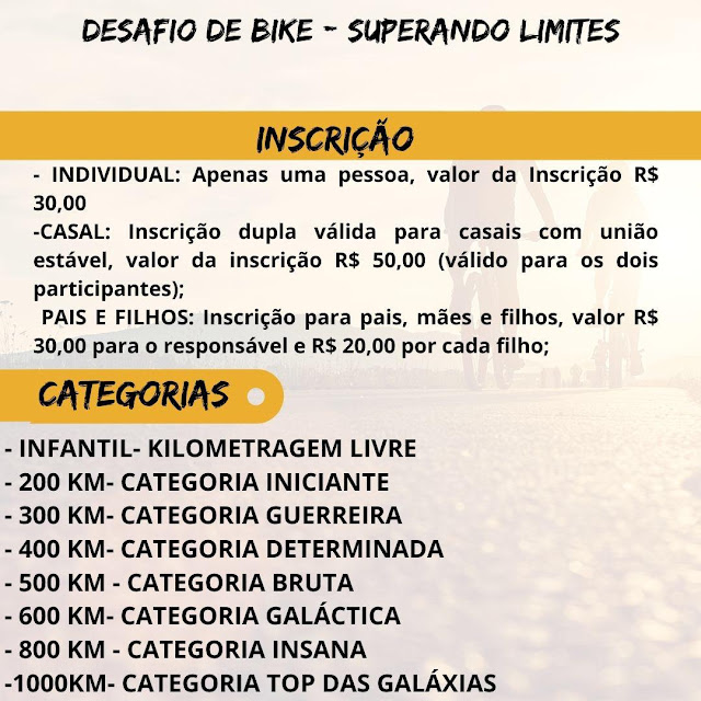 Observação: As inscrições CASAL e PAIS E FILHOS foram criadas para incentivar as famílias a pedalarem juntas, e desta forma ampliar os benefícios da pratica esportiva para todas as faixas etárias.
