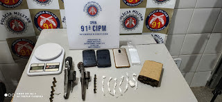 Ainda de acordo com a PM, foram apreendidos dois revolveres, de calibres 32 e 38, balança de precisão e embalagens e tabletes de Cocaína e Maconha, respectivamente.