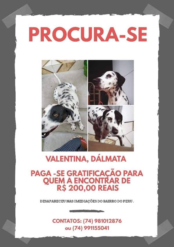 Uma internauta entrou em contato com a redação do Jacobina Informa para divulgarmos o desaparecimento da dálmata, Valentina. Uma gratificação de R$ 200,00 foi oferecida para quem encontrar e avisar sobre o paradeiro da cadela.