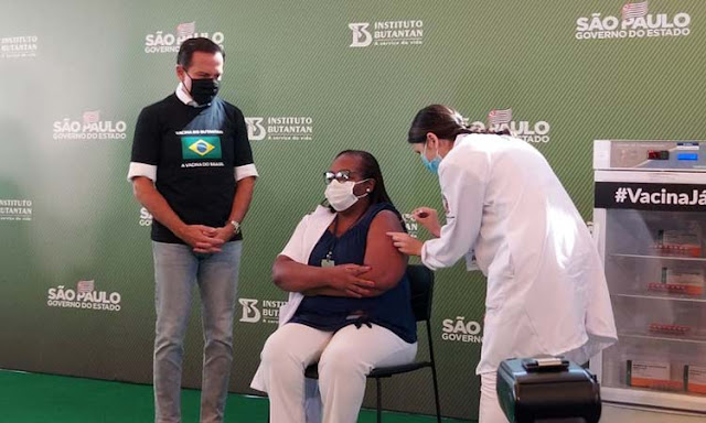 A enfermeira Mônica Calazans, de 54 anos, moradora de Itaquera, na Zona Leste da capital paulista, foi a primeira pessoa, fora dos estudos clínicos, a receber a vacina. Segundo informou o governo paulista, Mônica atua na linha de frente contra Covid-19 no Instituto de Infectologia Emílio Ribas.