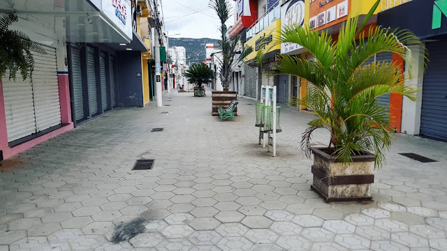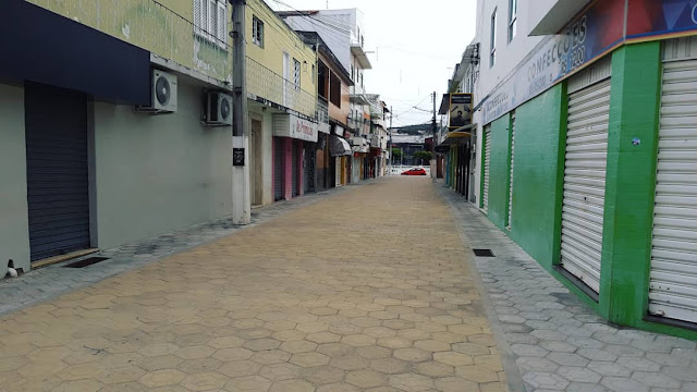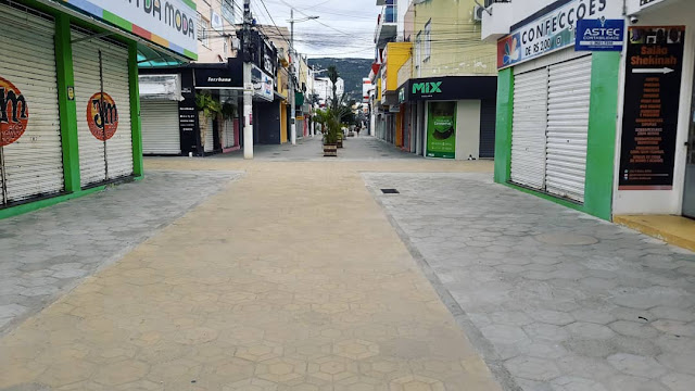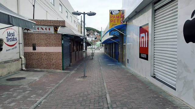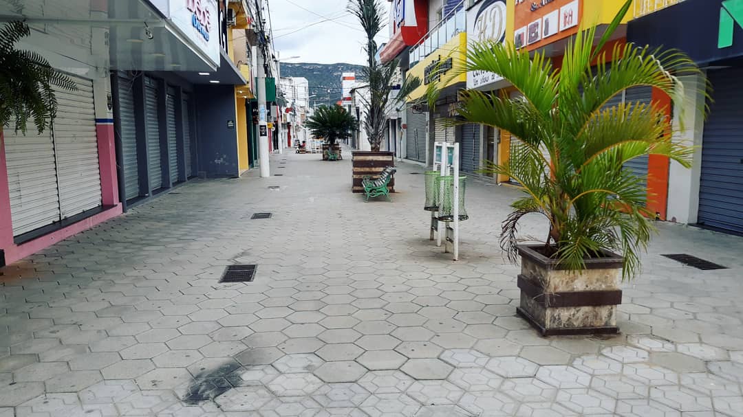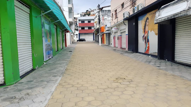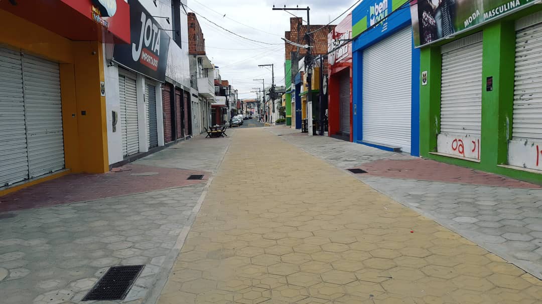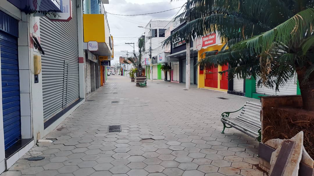 A área do Calçadão foi ampliada em 2019, sendo anexadas as ruas Afonso Costa e Coronel Teixeira. Nas imagens, feitas na tarde deste sábado (23), os estabelecimentos haviam suspendido o expediente e liberado os funcionários para o descanso do fim de semana.
