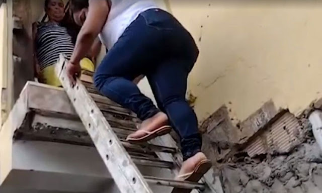 O acesso para casa de Eneide Bahia de Souza é feito por uma escada de alumínio que a filha dela, Tâmara Bahia, colocou no lugar para poder deixar o imóvel com destino ao trabalho todos os dias.