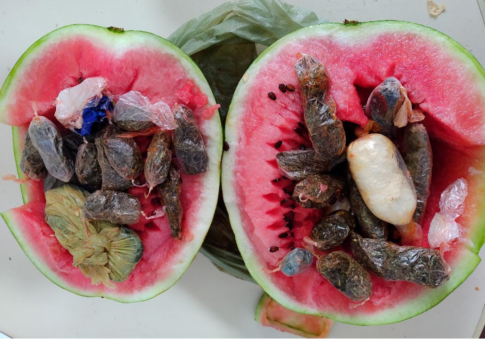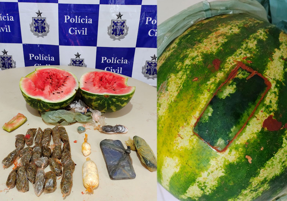 De acordo com informações passadas ao Jacobina Notícias, a mulher tentava adentrar na cadeia para visitar o esposo (que responde por Homicídio Qualificado), portando mantimentos, quando durante a revista, foi identificada uma melancia visivelmente adulterada. Ao abrir o fruto, os agentes encontraram 67g de cocaína, 1g de crack, 98g de maconha e 02 celulares.