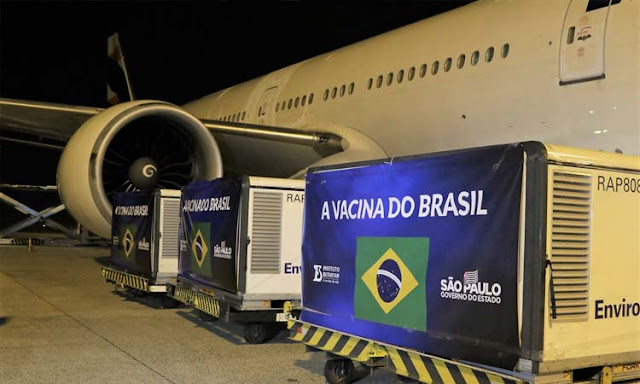 O avião que transportava 5,4 mil litros de insumos para produção da CoronaVac no Brasil chegou ao Aeroporto Internacional de Viracopos, em Campinas, em São Paulo, por volta das 22h40 desta quarta-feira (3). Ele veio da China trazendo o material necessário para que o Instituto Butantan comece a produzir o imunizante desenvolvido pela farmacêutica chinesa Sinovac.