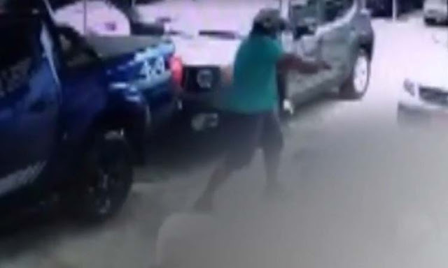 Câmeras de segurança flagraram o momento em que a vítima foi atingida na segunda-feira. Nas imagens, é possível ver dois homens em uma moto se aproximando da vítima, um deles desce do veículo e atira contra o homem que está de camisa laranja.
