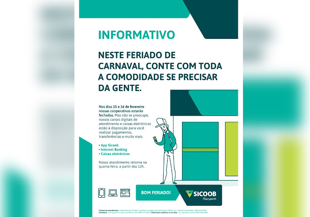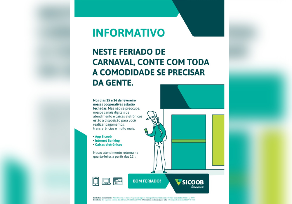 O Sicoob informa que nos dias 15 e 16 de fevereiro nossas cooperativas estarão fechadas. Mas não se preocupe, nossos canais digitais de atendimento e caixas eletrônicos estão à disposição para você realizar pagamentos, transferências e muito mais. Nosso atendimento retorna na quarta-feira, a partir das 12h.