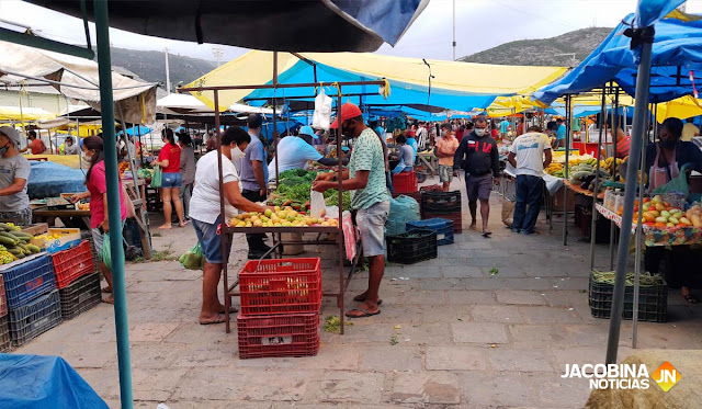 Ontem, a Prefeitura de Jacobina publicou decreto para regulamentar as feiras livres em todo o município, permitindo apenas a comercialização de alimentos 'in natura'. A venda de bebidas alcoólicas foi proibida. O horário estabelecido para a realização da feira livre na sede foi das 5h às 12h, e nos distritos e povoados, das 5h às 10h. A prefeitura também proibiu a entrada de feirantes vindos de outros municípios, independentemente do tipo de produto que iriam comercializar.