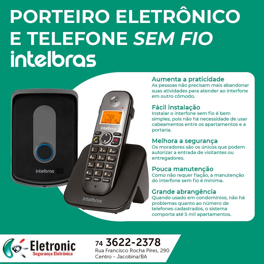 A Eletronic é uma empresa especializada em sistemas de segurança, seja com portão automático, câmeras de monitoramento ou porteiro eletrônico. Faça um orçamento, a equipe está pronta para lhe atender, na Rua Francisco Rocha Pires, n° 290, centro de Jacobina, telefone (74) 3622-2378.