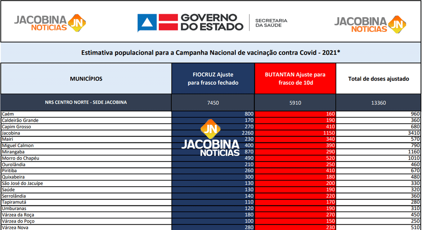 O Jacobina Notícias traz a tabela com a quantidade de vacinas recebidas por cada cidade da região, confira: