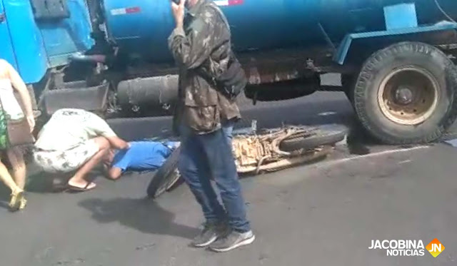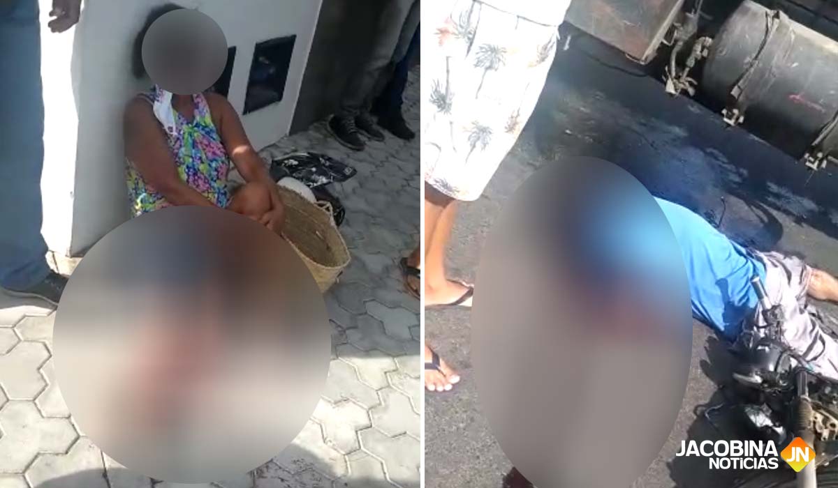 Uma mulher teve a perna dilacerada e um homem, condutor da moto que ela seguia, ficou ferido após uma colisão com um carro-pipa na manhã desta quarta-feira (31), no cruzamento da Rua Artur Diniz Veloso com a Rua Orlando Castro, no centro de Jacobina.