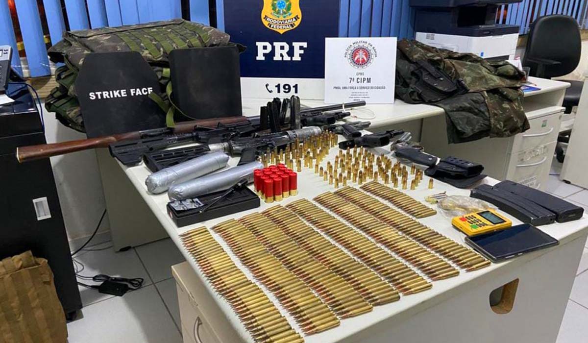 Após fazerem uma vistoria no interior do veículo, a PRF informou que um “arsenal bélico” foi encontrado. Com os suspeitos estavam um fuzil, uma submetralhadora 9 mm, duas pistolas 9mm; um revólver calibre 38, uma pistola 380 e uma espingarda calibre 12.