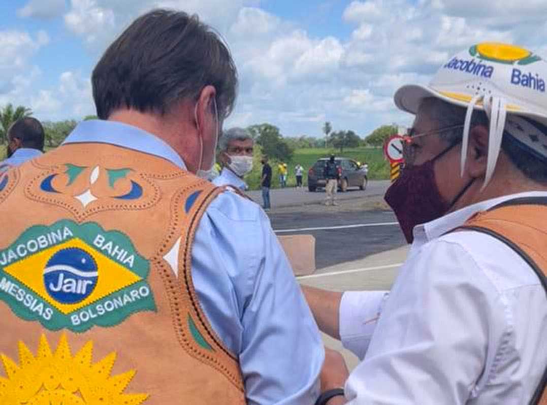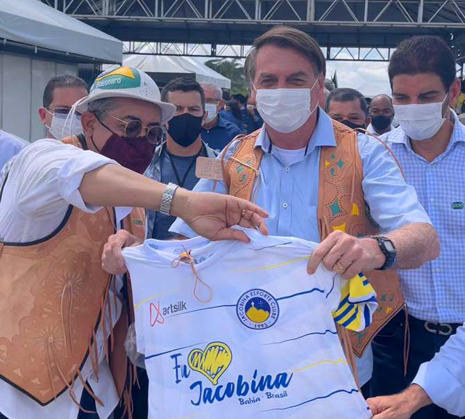 O presidente Jair Bolsonaro foi presenteado com uma camisa do Jacobina Esporte Clube e um jaleco de couro, também padronizada com o nome da cidade, durante sua passagem pela Bahia nesta segunda-feira (26). Foi a segunda vez que Bolsonaro ganhou e usou publicamente símbolos com referência à Jacobina.