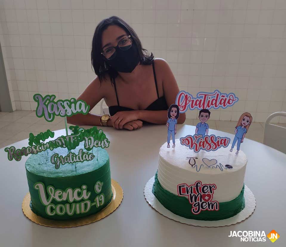 Kássia, gêmea que venceu a covid-19, e sua mãe, Alexsandra, viajaram mais de 100 quilômetros para agradecer a equipe do Hospital Regional de Jacobina pelo trabalho desenvolvido, o cuidado e atenção dispensados à elas e a todos os pacientes que precisam se recuperar na unidade. Como forma de gratidão, elas levaram dois bolos, um para a equipe da UTI e outro para os profissionais da clínica médica.