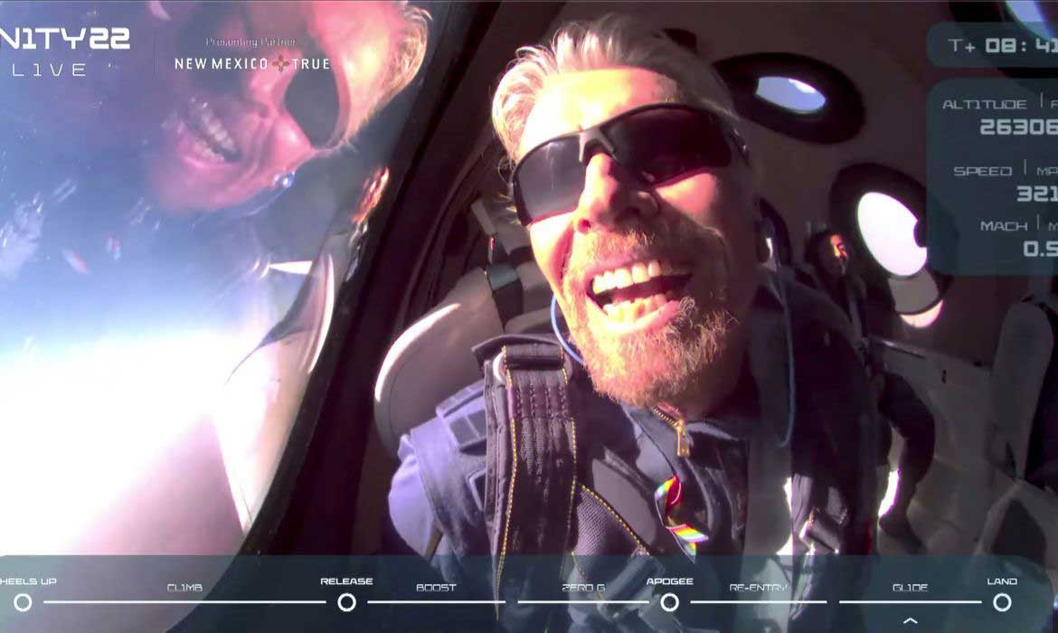 Branson, de 70 anos, com dois pilotos e três especialistas da empresa Virgin Galactic atingiram uma altitude de cerca de 88 quilômetros. Viajaram na vertical a uma velocidade três vezes superior à do som, o que foi suficiente para conseguirem uns minutos de gravidade zero.