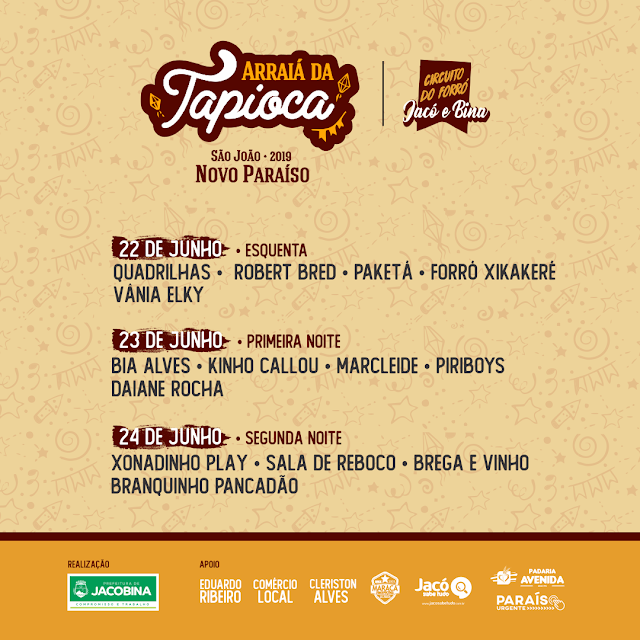 É São João! Simbora arrastar o pé! Arraiá da Tapioca 2019, São João de Novo Paraíso, de 22 a 24 de Junho!