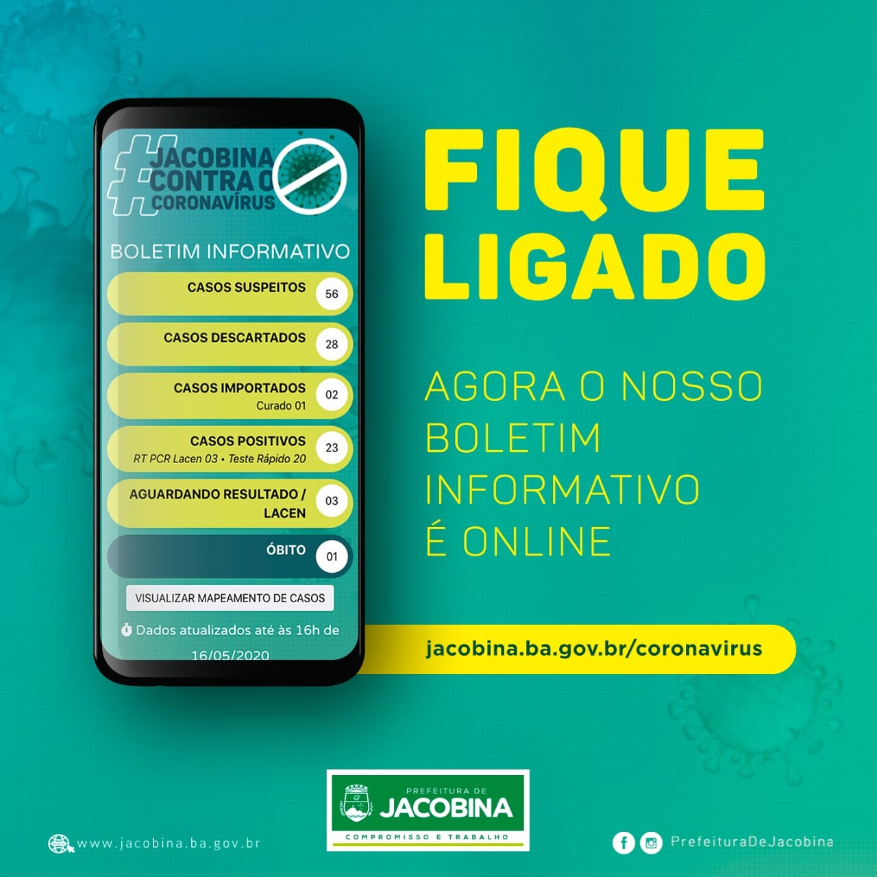 Todas as ações do projeto social Jacobinidade e Solidariedade serão mostradas no hotsite sobre o Coronavírus. No último boletim, a Secretaria Municipal da Saúde faz um balanço de todos os testes realizados em Jacobina desde o dia 16 de março. Acesse clicando aqui e confira os resultados oficiais divulgados até às 16h do último sábado (16).